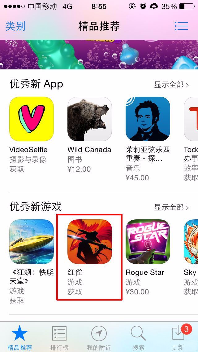 闪联云视发行的国人原创格斗手游《红雀》单机版,凭借在移动平台中独树一帜的街机格斗游戏题材,和经典的1V1三局两胜的游戏玩法、挑战终级隐藏BOSS的游戏目标,《红雀》上线不久就获得了苹果首页“优秀新游戏”推荐。对优秀的原创精品应用,苹果商店(App Store)都给予大力的推广支持。尤其在当今RPG、卡牌、跑酷、三消类等休闲娱乐游戏产品越来越多的环境下,《红雀》这款独具匠心的街霸式格斗创新游戏,不仅得到了苹果的关注更得到了玩家的欢迎。